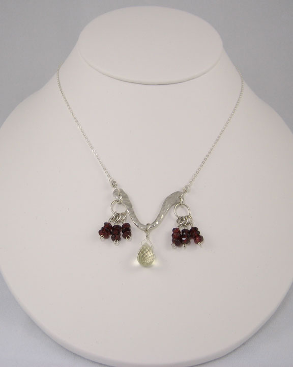 This pendant has a lot of motion. A delicate silver chain connects to the chandelier base, which is made up of hammered Argentium sterling silver in an open vase shape. Strings of garnet rondelles hang from each side of the pendant and a lemon quartz briolette hangs in the center. The sterling silver clasp is surrounded by garnets and silver cubes.