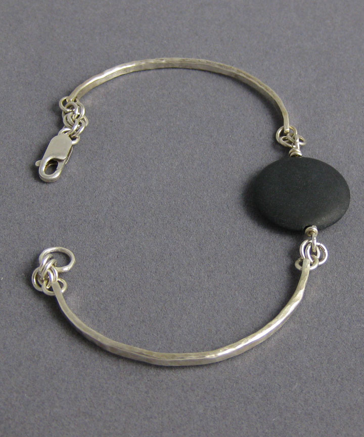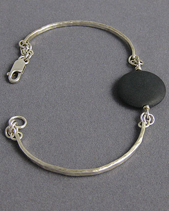 The sides of this bracelet are hammered bangles, which meet at a flat disc-shaped black onyx bead. The elements are connected with linked chain.