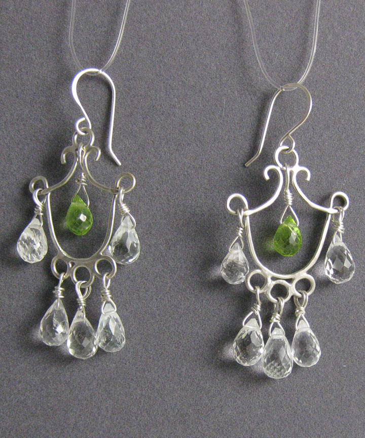 These long, dangly earrings combine very pale aquamarine briolettes with bright-green peridot.