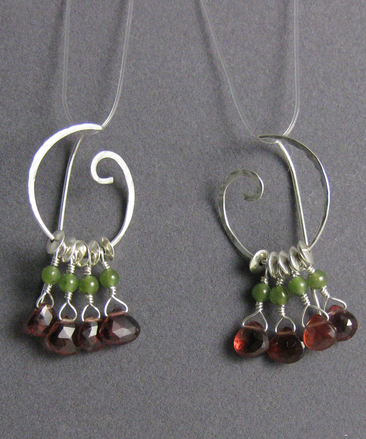 These earrings consist of hammered Argentium sterling silver spirals. Garnet and jade gems accent the spirals.