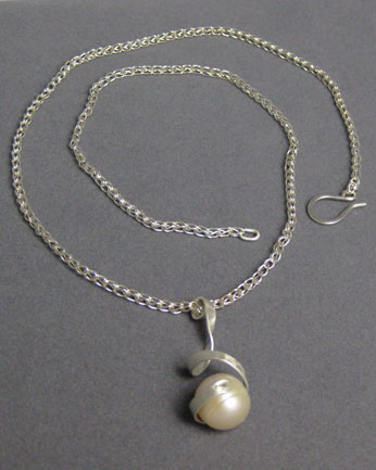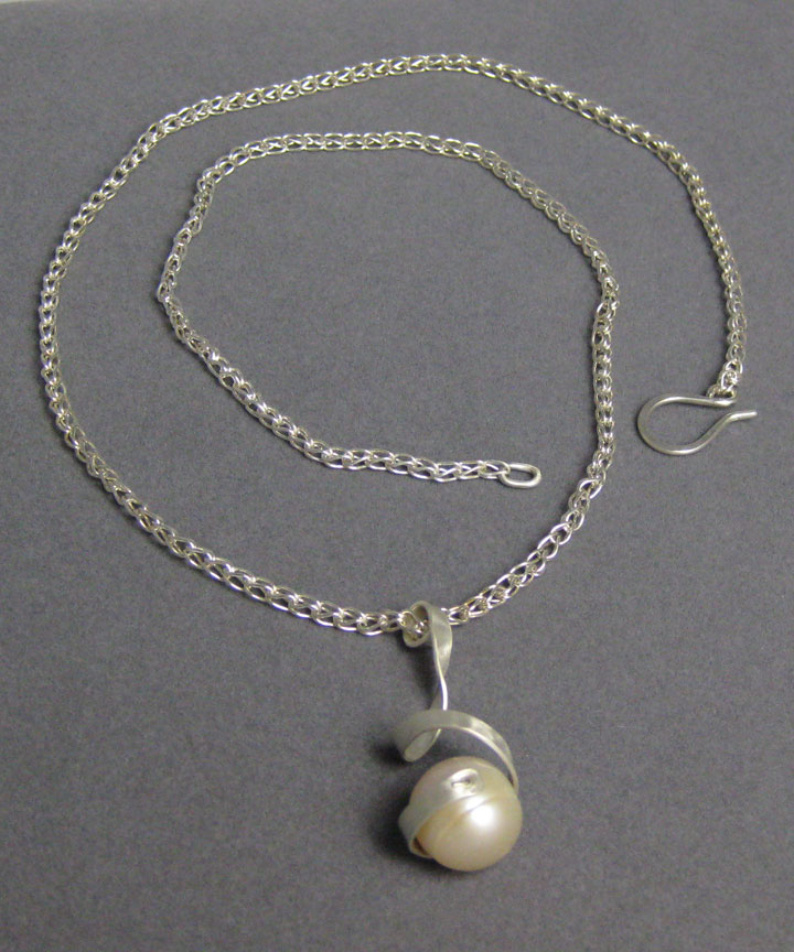 A large pink cultured freshwater pearl hangs encased in a silver spiral. The hand-made chain is formed from fine silver. The clasp is Argentium sterling silver.
