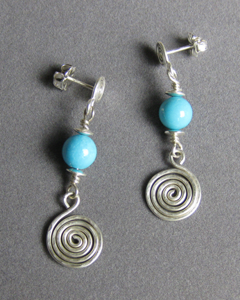 In these earrings, turquoise beads are sandwiched between two silver spirals.
