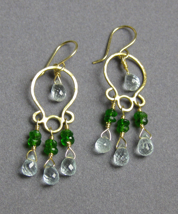 The saturated color of these earrings pops out at you: 18K gold chandelier frames with bright green chrome diopside and delicate blue aquamarine briolettes.