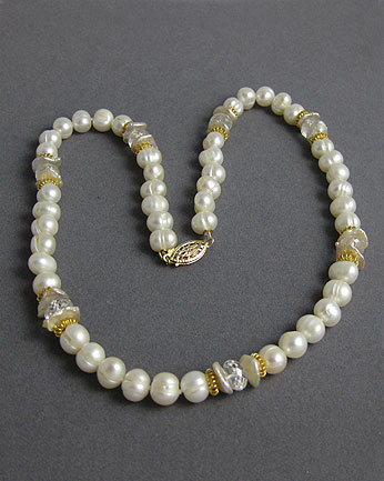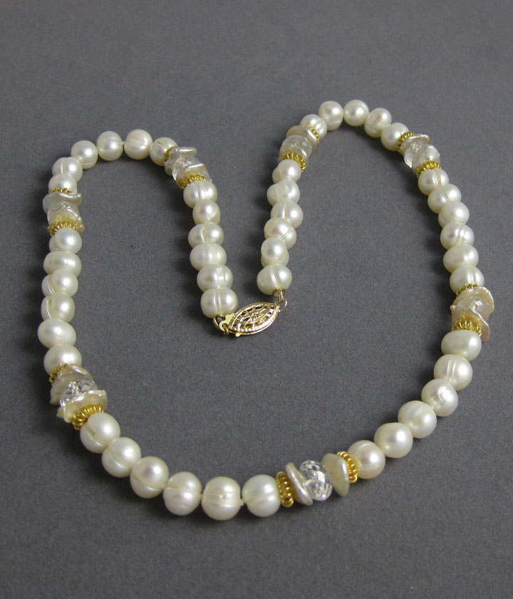 A modern update to the classic string of white pearls, this necklace alternates colorless faceted zircon gemstones, cultured freshwater keshi pearls, and vermeil beads with cultured freshwater white circled pearls (I.e., they show thin circles around them).