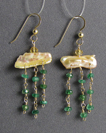 In these earrings, sparkly green, dyed topaz drops hang from a peach cultured freshwater pearl.