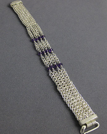 This bracelet combines two ancient chain styles, single loop-in-loop and a single mesh. Bright purple amethysts accent the fine silver wire.
