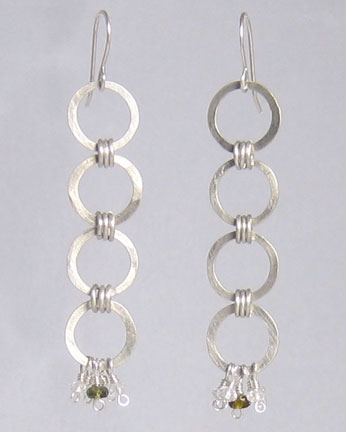 These long, slinky earrings are made up of interlinked hammered and round loops. Colorless topaz and green tourmaline add some color and sparkle.