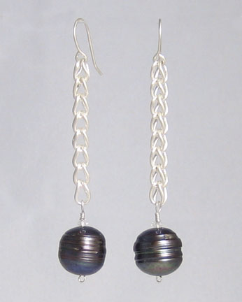 These long earrings feature circled, black cultured freshwater pearls handing from a hand-made loop-in-loop chain. Colorless topaz provides a bit of sparkle.