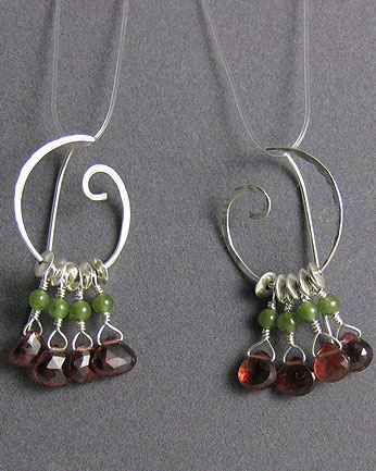 These earrings consist of hammered Argentium sterling silver spirals. Garnet and jade gems accent the spirals.