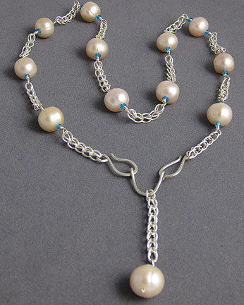 This pearl necklace alternates pink cultured freshwater pearls with fine silver chain. Neon blue apatite gems accent the pink pearls. The pendant is removable.