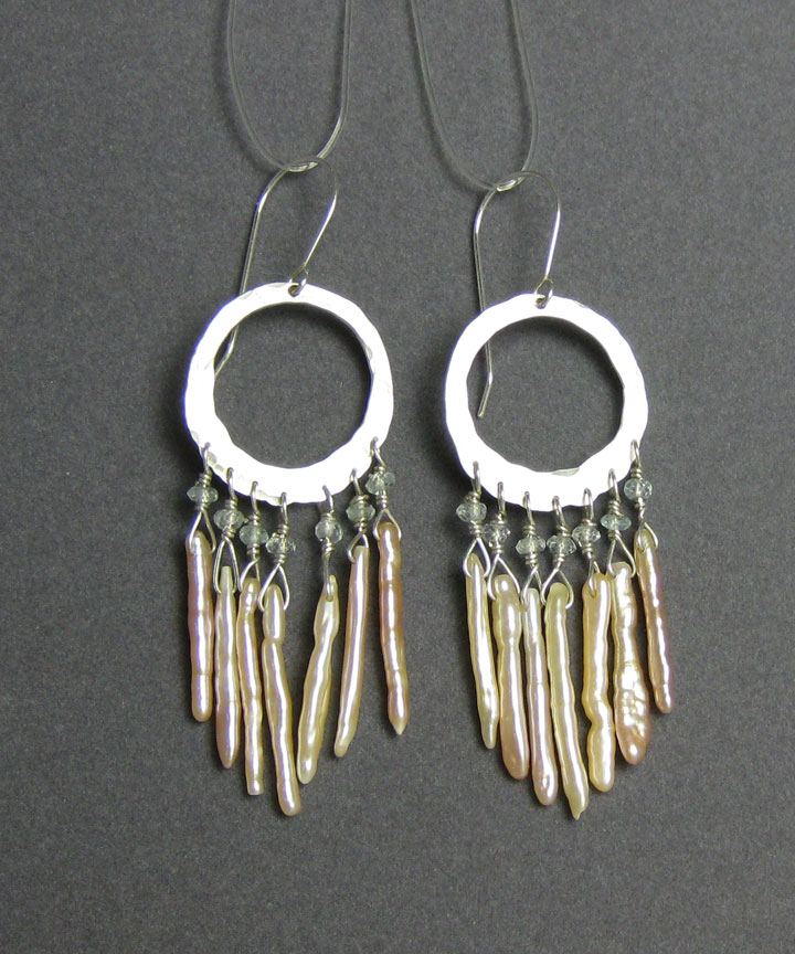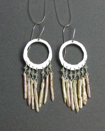 These long, dangly earrings combine thin cultured freshwater stick pearl