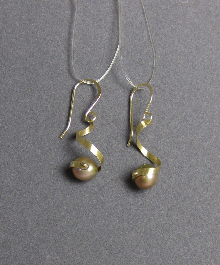 In these simple, elegant earrings, a small natural-color cultured freshwater pearl is wrapped in an 18K-gold metal spiral.