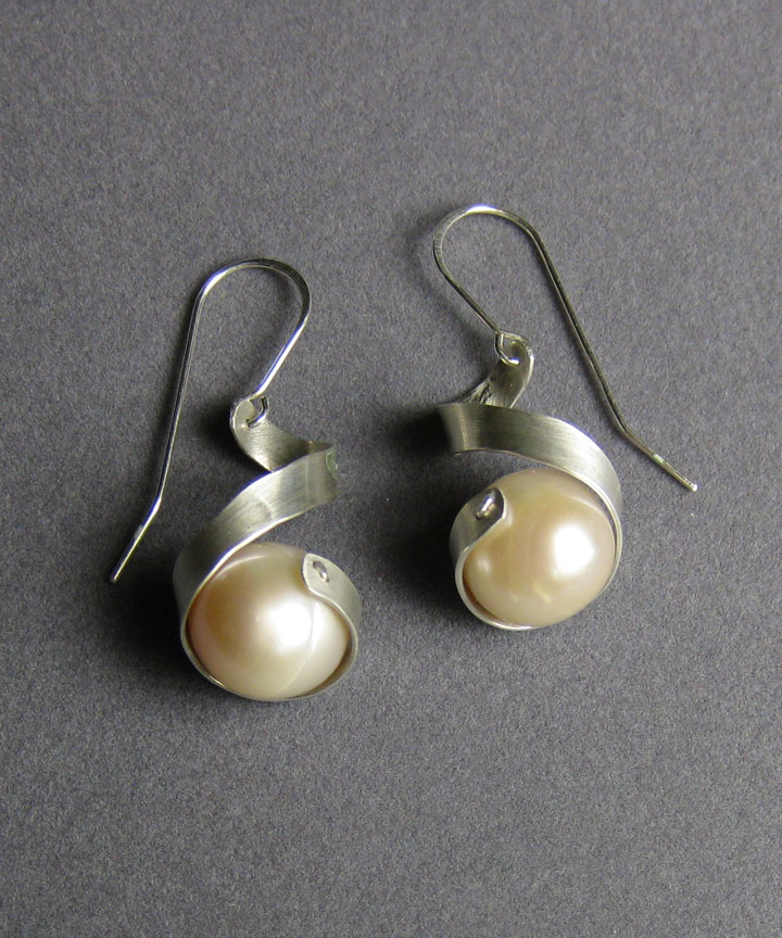 In these simple, elegant earrings, a large natural-color cultured freshwater pearl is wrapped in a silver metal spiral.