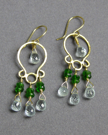 The saturated color of these earrings pops out at you: 18K gold chandelier frames with bright green chrome diopside and delicate blue aquamarine briolettes.